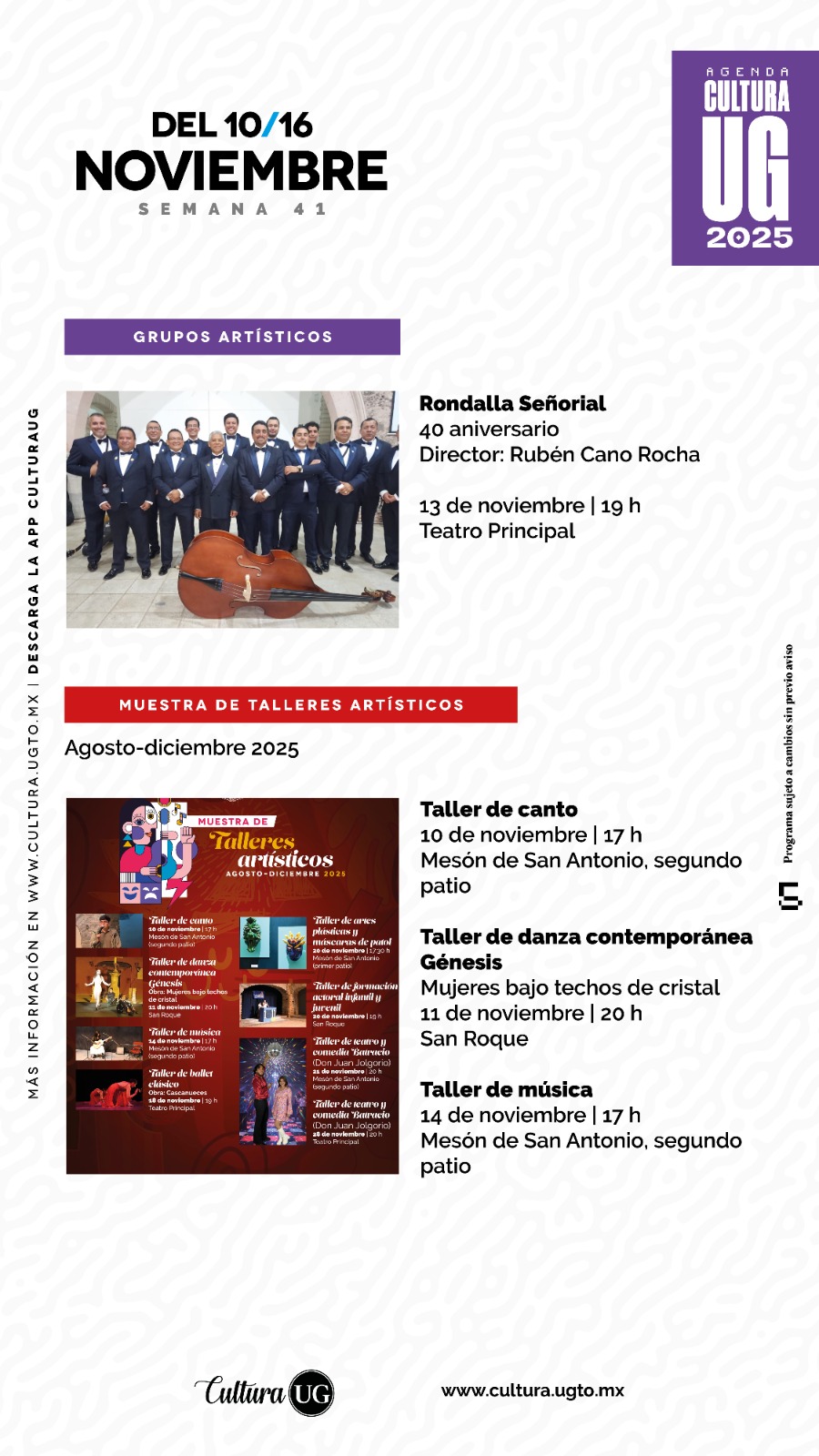 Consulta más información sobre la difusión del arte, la ciencia y la cultura en los canales oficiales de @Cultura UG y no te pierdas la oportunidad de vivir una semana llena de experiencias artísticas. Programación sujeta a cambios sin previo aviso.