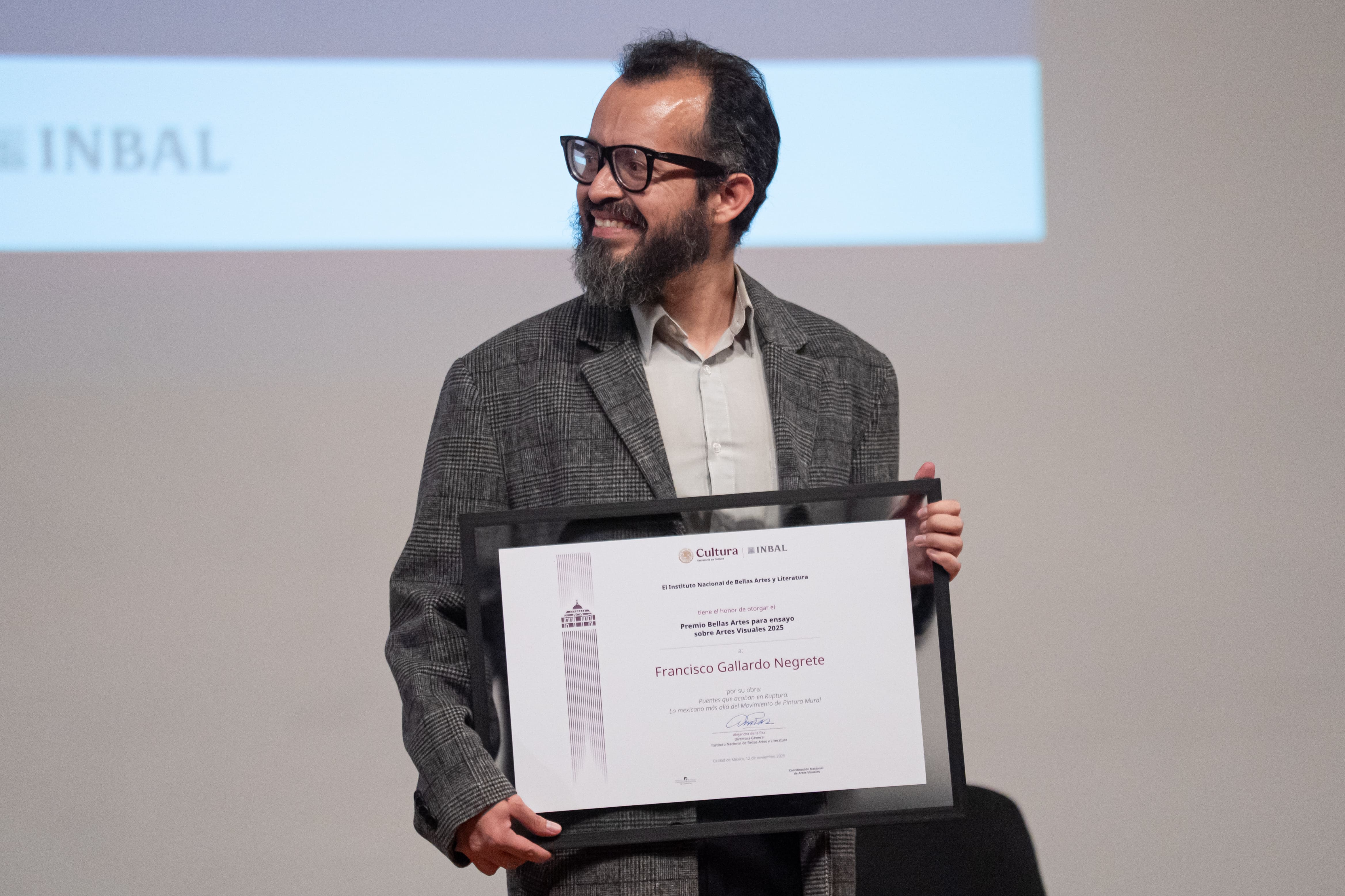 El primero de estos, otorgado por la Secretaría de Cultura del Gobierno de México y el Instituto Nacional de Bellas Artes y Literatura (INBAL), a través de las coordinaciones nacionales de Artes Visuales (CNAV) y Literatura (CNL), corresponde a su obra Puentes que acaban en Ruptura. Lo mexicano más allá del Movimiento de Pintura Mural, donde redescubre la figura de José Moreno Villa, crítico de arte español, quien, después del exilio republicano, fue clave para las artes visuales mexicanas del siglo XX, especialmente en el Bajío.