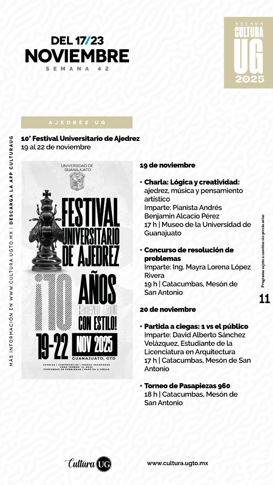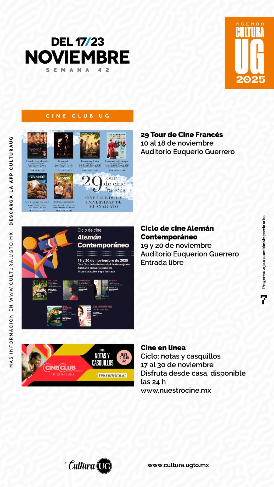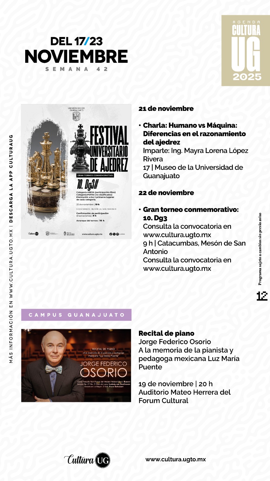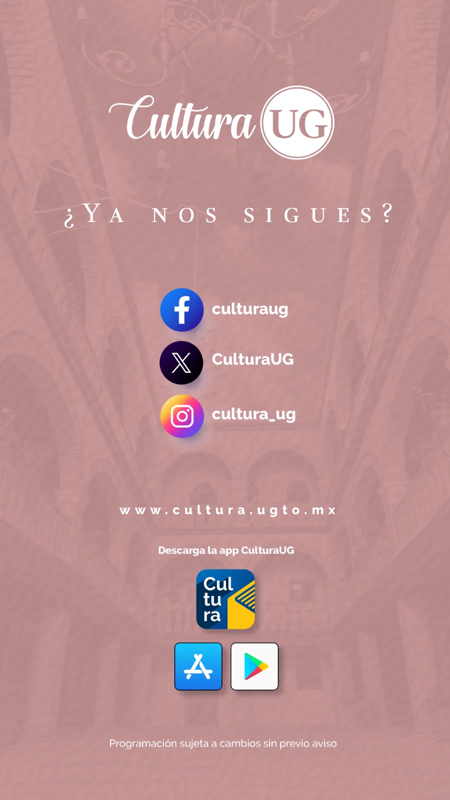 Consulta más información en www.cultura.ugto.mx, así como en las redes sociales @Cultura UG, y no te pierdas la oportunidad de vivir experiencias artísticas. Programación sujeta a cambios sin previo aviso.