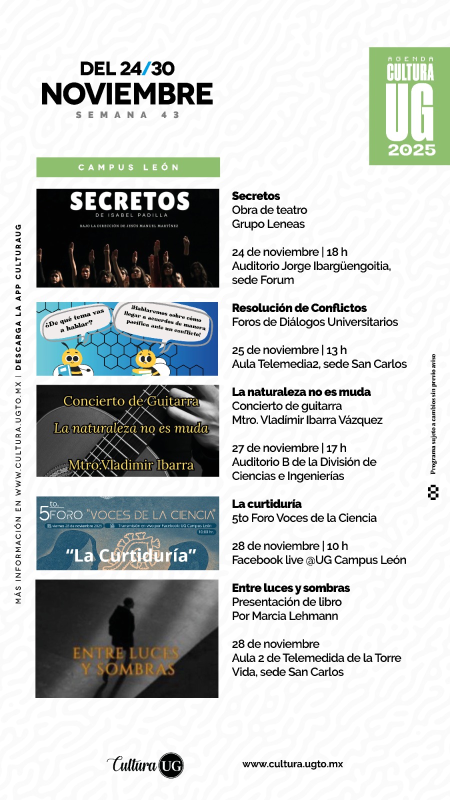Guanajuato, Gto., a 21 de noviembre de 2025.- El arte y los eventos culturales de la Universidad de Guanajuato (UG) siguen presentes en la última semana de noviembre con conciertos, muestras de cine y exposiciones que estarán en exhibición hasta el 23 de enero de 2026.