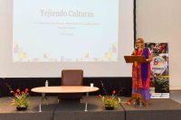 En su ponencia "Tejiendo comunidad: el rol de la gestión cultural como articuladora del desarrollo local sostenible", Myrna Vargas llevó a los asistentes a un recorrido por la región Chinantla en Oaxaca, donde desde hace dieciocho años ha trabajado con modelos de gestión basados en el respeto a los usos y costumbres, la sostenibilidad y la participación comunitaria.
