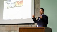El segundo ponente fue el Dr. Abner Josué Gutiérrez Chávez, médico veterinario zootecnista del Campus Irapuato-Salamanca de la UG, con el tema “De animales a humanos: zoonosis emergentes impulsadas por el cambio climático”. Explicó la convivencia inherente entre seres humanos y animales, y cómo provoca cambios.