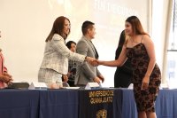 Felicitó a las y los egresados por la culminación de un sueño, el cual fue construido con compromiso y responsabilidad. Asimismo, les invitó a responder desde la ética y el conocimiento a los retos que el mundo les exige, asumiéndolos como una oportunidad.