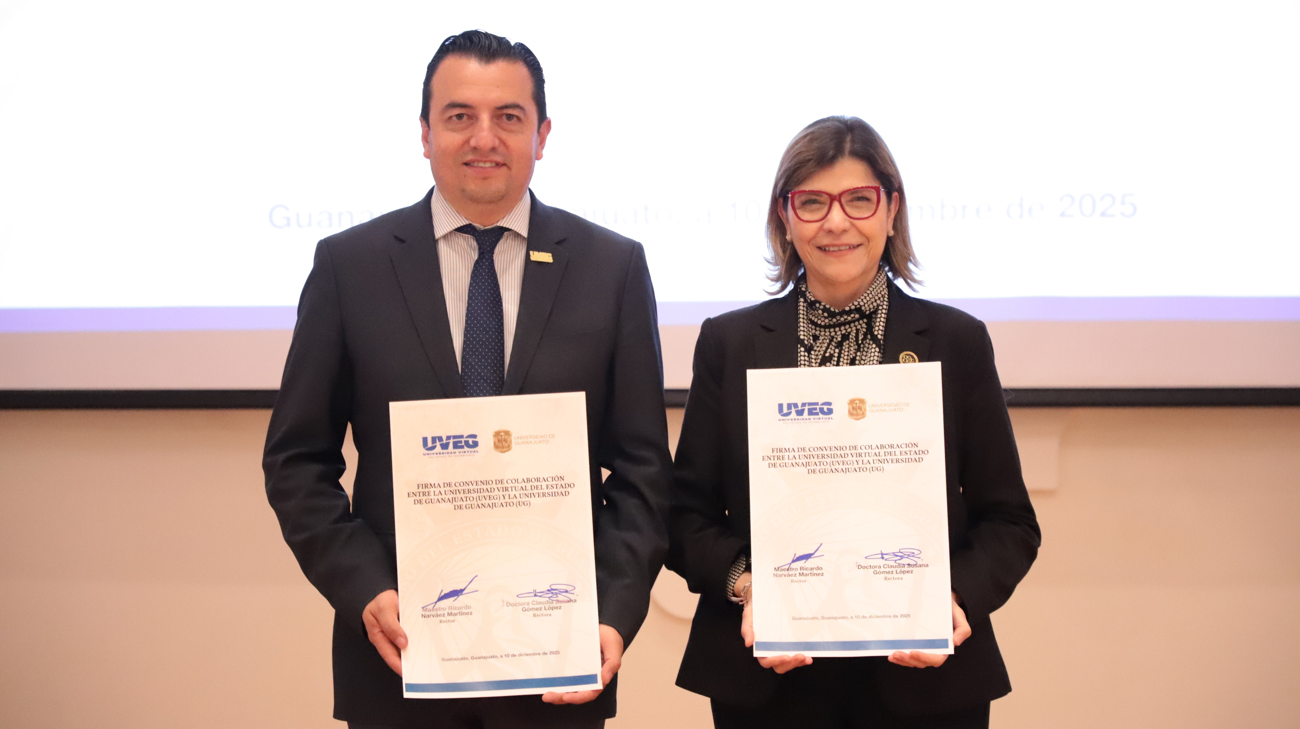 Guanajuato, Gto., a 10 de diciembre de 2025.- Con la finalidad de sumar fortalezas e impulsar las microcredenciales y la investigación, la Universidad de Guanajuato (UG) y la Universidad Virtual del Estado de Guanajuato (UVEG) firmaron un convenio de colaboración.