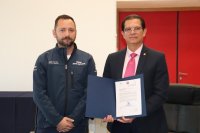 El reconocimiento entregado por el Subsecretario de Planeación de la Secretaría de Seguridad Ciudadana, Mtro. Luis David Gamba Castillo, fue recibido por el Rector del Campus Guanajuato de la UG, Dr. Martín Picón Núñez, acompañado del personal de la Unidad de Prevención y Seguridad Universitaria del Campus y Directivos de la DI.