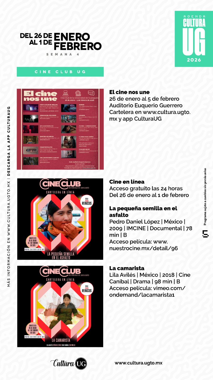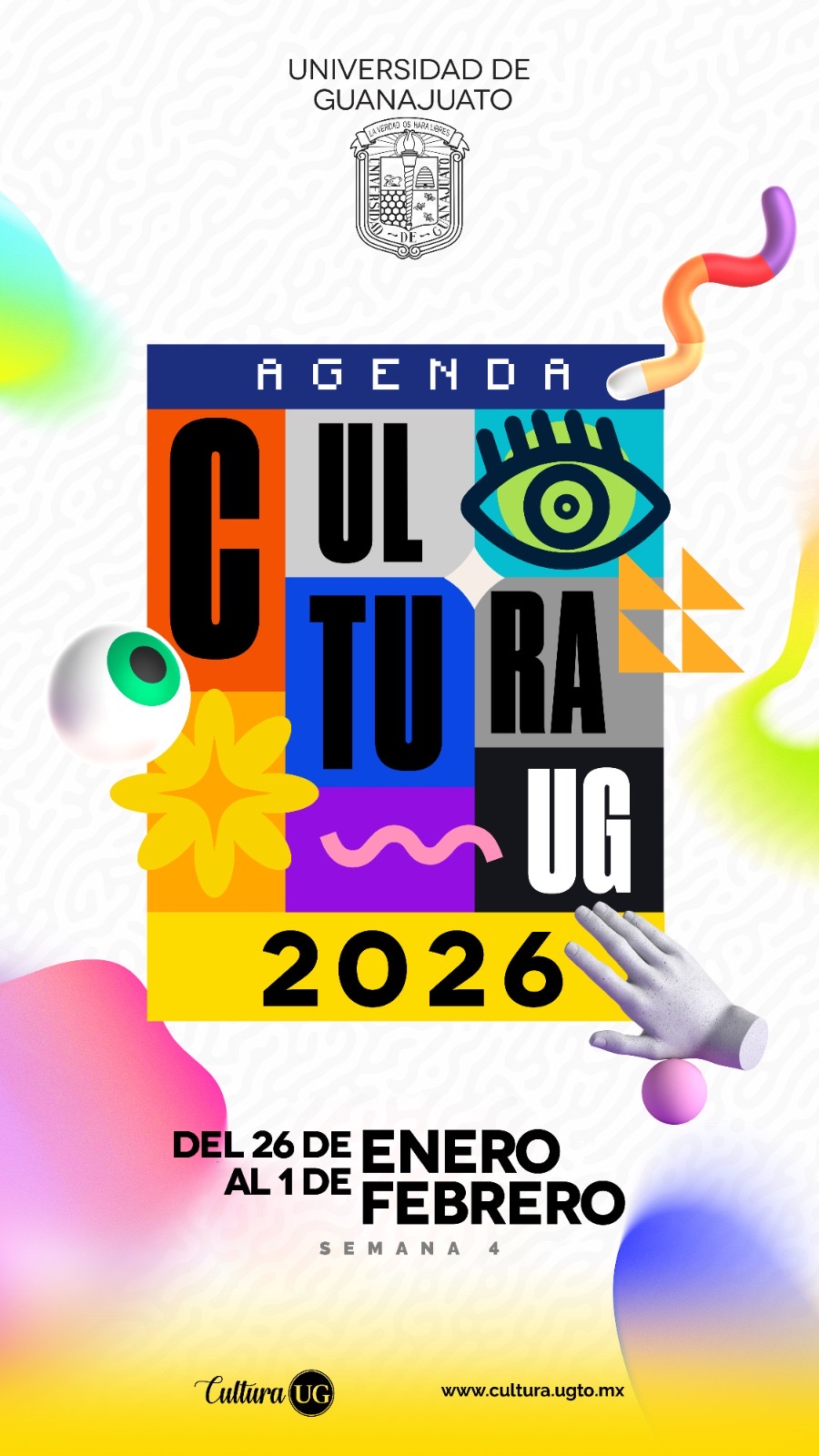 Guanajuato,Gto., a 23 de enero de 2026.- La Universidad de Guanajuato (UG) presenta su Agenda Cultura del 26 de enero al 1 de febrero, con una programación que incluye conciertos, proyecciones de cine, talleres artísticos, convocatorias y actividades comunitarias.