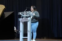 Brindó un mensaje de agradecimiento y compromiso, la alumna Susana Aurora Zárate Villaseñor, galardonada con el premio Maestro Antonio Torres Gómez; en nombre de las y los alumnos premiados de la Licenciatura en Derecho.