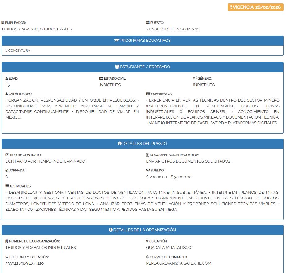 Puesto: VENDEDOR TÉCNICO MINAS | Educación: Licenciatura | Edad: 25 años | Estado civil: Indistinto | Género: Indistinto | Ubicación: Guadalajara, Jalisco | Vigencia: 28/02/2026