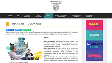 Con base en el Reglamento de Becas, Apoyos y Estímulos estudiantiles de la Universidad de Guanajuato aprobado por el Consejo General Universitario el 03 de julio de 2018 y publicado en la gaceta universitaria el 30 de octubre de 2018 en su Capitulo Tercero “Apoyos institucionales” se indica que: