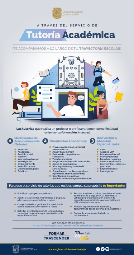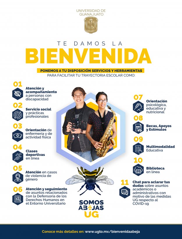 La Dirección de Igualdad y Corresponsabilidad Social, a través del Programa de Inclusión Social, ofrece servicios de atención, orientación y acompañamiento a estudiantes con discapacidad inscritos(as) en cualquier nivel y programa educativo de la Universidad de Guanajuato, antes, durante o al final de las clases virtuales y presenciales mediante estrategias didácticas inclusivas.