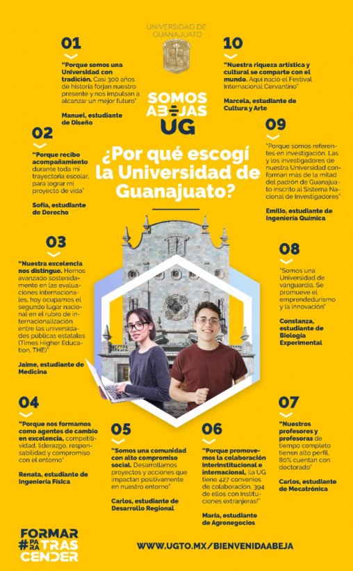Al promover espacios de convivencia académica entre personas provenientes de diferentes contextos, la Universidad de Guanajuato reconoce la relevancia de un mundo más interconectado al considerar la integración de la dimensión internacional en cada una de sus funciones y coadyuva a la formación integral de personas respetuosas de la interculturalidad, la diversidad de creencias, los valores y las prácticas sociales.