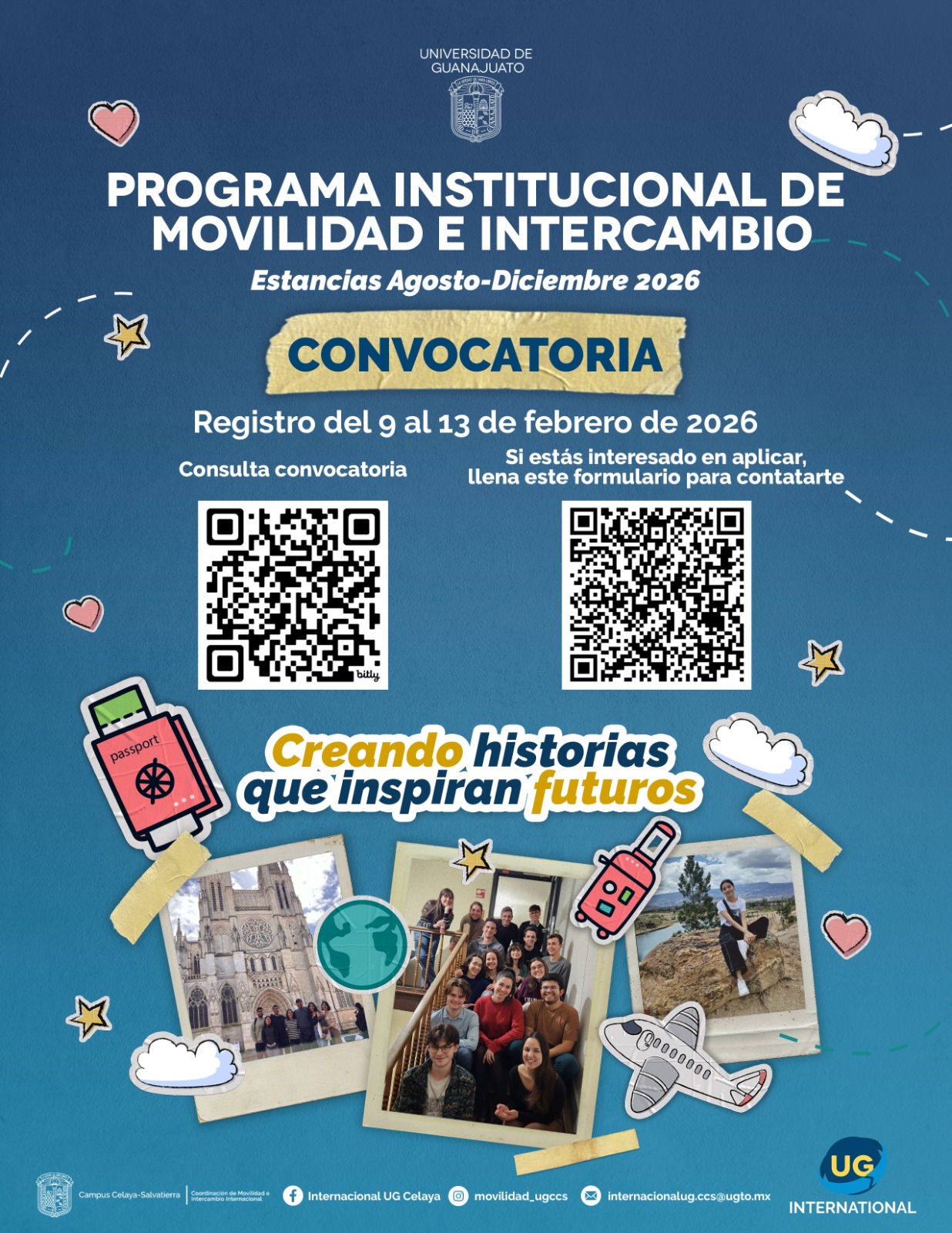Con el objetivo de brindar oportunidades a estudiantes de nivel licenciatura de la Universidad de Guanajuato (UG) con interés en fortalecer sus competencias disciplinares, generales y específicas, la Dirección de Internacionalización (DIN) invita a participar en la: Convocatoria Programa Institucional de Movilidad e Intercambio Estudiantil (PMI) Estancia Semestral Agosto-Diciembre 2026
