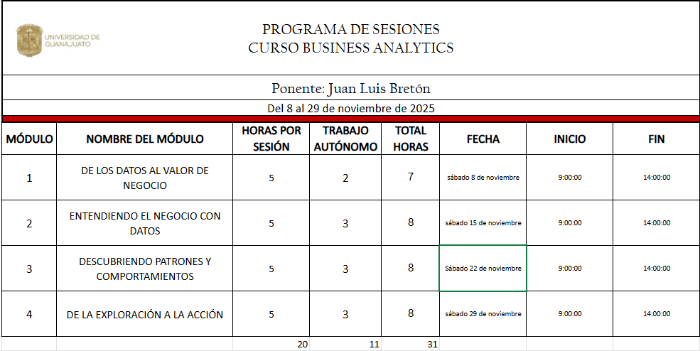 En un entorno empresarial cada vez más competitivo, las organizaciones que logran convertir datos en entendimiento acceden una ventaja competitiva decisiva. Sin embargo, en la mayoría de las micro, pequeñas y medianas empresas, los datos suelen estar subutilizados o se interpretan sin un marco suficientemente riguroso. Este programa de Business Analytics está diseñado para directivos y personal técnico de empresas que buscan detonar una cultura de decisiones basadas en entendimiento al interior de sus propias organizaciones. El curso ofrece una introducción práctica y accesible a los fundamentos de la analítica de negocios, combinando conceptos de estadística, técnicas básicas de análisis y casos aplicados al contexto empresaria. A lo largo de las sesiones, los participantes desarrollarán la habilidad de pensar de forma estadística sobre los problemas de negocio, aprenderán a explorar y comunicar resultados de datos, y practicarán la toma de decisiones informadas mediante escenarios, pruebas y modelos sencillos. Más que una formación técnica especializada, este programa busca formar agentes de cambio que impulsen el uso estratégico de la información en sus organizaciones, promoviendo decisiones mejor fundamentadas, reducción de la incertidumbre y un crecimiento empresarial sostenido.