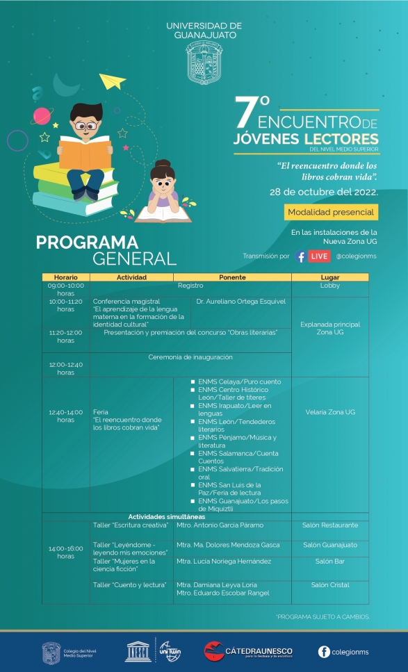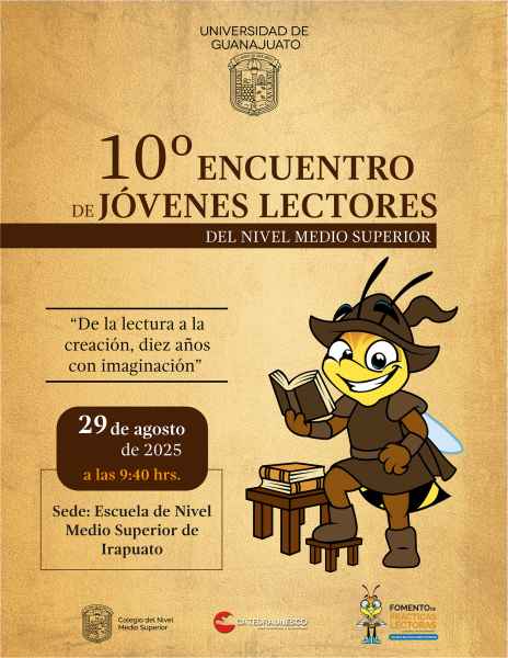 La Universidad de Guanajuato, a través del Colegio del Nivel Medio Superior, en el marco de la celebración del 10.º Encuentro de Jóvenes Lectores del Nivel Medio Superior: "De la lectura a la creación, diez años con imaginación”.