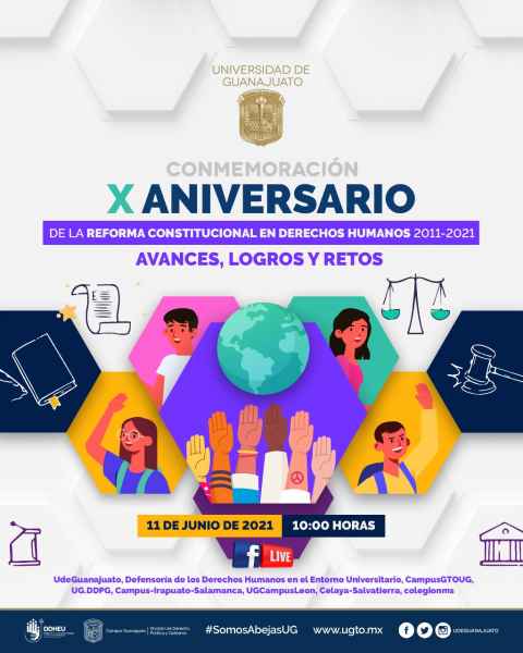 Guanajuato, Gto., a 11 de junio de 2021.- La comunidad de la Universidad de Guanajuato conmemora el X Aniversario de la Reforma Constitucional en Derechos Humanos 2011-2021 con una serie de charlas en las que analizarán avances, logros y retos que se vislumbran a una década de su implementación.