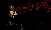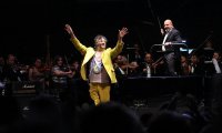 Con un traje amarillo que se distinguía en la oscuridad de la noche, Fito Páez brilló en el escenario y logró crear una dialéctica sorprendente con los músicos de la OSUG que en todo momento tocaron haciendo una sinergia con la música y las letras del reconocido cantante argentino.