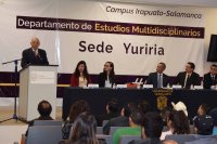 Autoridades universitarias y municipales acudieron al programa de festejos que comenzó con una conferencia a cargo del Dr. Arturo Lara López, ex Rector General de la Universidad de Guanajuato y principal impulsor de este proyecto, quien al hablar de los antecedentes y perspectivas de la sede Yuriria, comenzó presentando una línea del tiempo de la casa de estudios y las condiciones del pasado reciente que llevaron a la UG a su transformación.