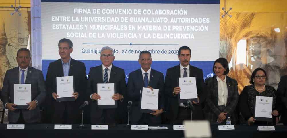 Guanajuato, Gto., a 27 de noviembre de 2019.- Autoridades de la Universidad de Guanajuato (UG), del gobierno estatal y de 13 municipios en donde tiene presencia la Casa de Estudios, firmaron un convenio de colaboración para llevar a cabo una estrategia integral de seguridad, con acciones focalizadas a las necesidades de cada sede.