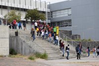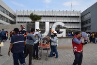 En el mismo tiempo, la comunidad estudiantil realizó el desalojo de las instalaciones, teniendo como punto de reunión las escalinatas en la parte frontal del edificio.
