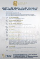 El proceso de selección y designación del equipo de UGénero consta de seis etapas, dos de las cuales ya han sido concluidas: el periodo de registros de aspirantes, y la verificación del perfil y notificación a las personas que cumplieron con los requisitos establecidos en las convocatorias que fueron emitidas en el mes de febrero.