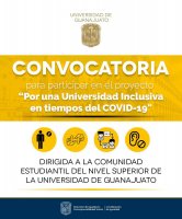 Guanajuato, Gto., a 10 de agosto de 2020.- La Dirección de Igualdad y Corresponsabilidad Social, convoca a estudiantes de nivel superior de la Universidad de Guanajuato (UG) a convertirse en "agentes sociales incluyentes", en el Proyecto "Por una Universidad Inclusiva en tiempos del COVID-19" a través del servicio social universitario, con la intención que puedan colaborar en la orientación y acompañamiento de una manera cálida y humana.
