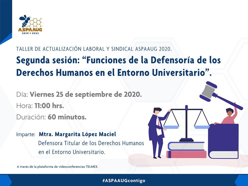 Guanajuato, Gto., 22 de septiembre de 2020.- Desde el pasado 11 de septiembre y hasta el próximo 6 de noviembre, la Asociación Sindical de Personal Académico y Administrativo de la Universidad de Guanajuato (ASPAAUG), a través de la Secretaría del Trabajo, lleva a cabo de manera virtual el Taller de Actualización Laboral y Sindical, dirigido a sus afiliadas y afiliados, así como a la comunidad universitaria en general.