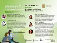 Para este tema en particular, fueron invitadas como panelistas, la Mtra. Araceli Arroyo Rodríguez, diseñadora de interiores y maestra en administración; la Mtra. Berenice Arnold; artista interdisciplinaria, investigadora y profesora universitaria; la alumna Katia Michelle Ramírez López, estudiante de octavo semestre de arquitectura y quien pertenece a la Colectiva Feminista "Tinta Violeta".