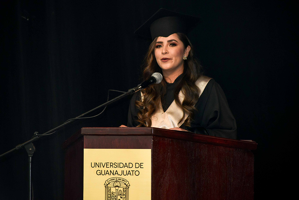 Durante el acto protocolario la alumna Nancy Ureño Dorado, egresada de la especialidad en Enfermería Médico Quirúrgica, agradeció la distinción al dar el mensaje en representación de la comunidad egresada y destacó el papel tan importante que hicieron a lo largo de los meses de formación profesional, reconoció el apoyo que recibieron de la familia y el respaldo académico que la UG brinda a las y los nuevos especialistas en enfermería.