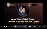 Uno de los invitados fue el Dr. Miguel Ángel Bello Jiménez, de la Universidad Autónoma de San Luis Potosí, quien mostró avances en dispositivos y láseres de fibra óptica desarrollados en el Instituto de Investigación en Comunicación Óptica. Inició su plática mostrando el desarrollo de un modulador en amplitud todo-fibra y su aplicación en un láser de amarre de modos activo. También presentó resultados en láseres pasivos de fibra óptica y la emisión de pulsos de ruido.
