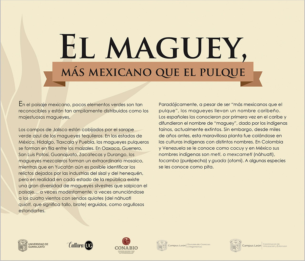 Finalmente, continúan las exposiciones de las colecciones de la Comisión Nacional para el Conocimiento y Uso de la Biodiversidad: El maguey, más mexicano que el pulque, en el vestíbulo del Edificio del Departamento de Estudios Culturales de la Universidad de Guanajuato, Sede Fórum, y México, centro de origen y diversidad de plantas. México megadiverso, en el vestíbulo de la Biblioteca de la División de Ciencias e Ingenierías del Campus León, ambas finalizarán este 9 de diciembre.