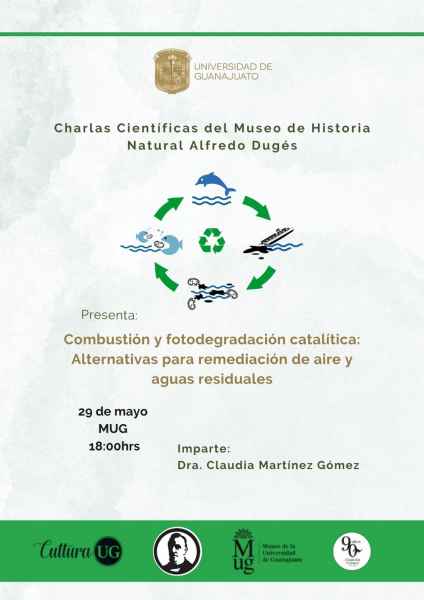 La charla “Arte, ciencia y cuerpo” impartida por la Dra. María Graciela Manjarrez Cuellar este 30 de mayo a las 17:00 horas en el Mesón de San Antonio; en el Museo de la UG (MUG) se presentarán “Combustión y fotodegradación catalítica: Alternativas para remediación de aire y aguas residuales” de la Dra. Claudia Martínez, este 29 de mayo a las 18:00 horas y “El camino del arte postmedial”, del Dr. Gonzalo Enrique Bernal este 31 de mayo a las 17:30 horas.