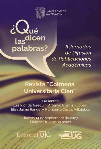 Guanajuato, Gto., a 13 de septiembre de 2023.- La Universidad de Guanajuato (UG) a través de la Librería UG, invitan a la presentación del número 100 de la Revista Colmena Universitaria a celebrarse el próximo jueves 14 de septiembre de 2023 a las 12:00 horas en este espacio que alberga miles de historias mediante sus libros.