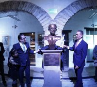 Guanajuato, Gto., a 3 de diciembre de 2019.- Con la develación de un busto y la presentación del libro "Las notas y los días. Las marañas del ocio", que recoge 11 años de reflexiones, se rindió homenaje a la vida y trayectoria del Mtro. Eugenio Trueba Olivares, ex Rector de la Universidad de Guanajuato y Director Emérito del Teatro Universitario.