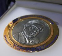 Correspondió al hijo del Mtro. Eugenio Trueba, el Lic. Armando Trueba Uzeta, dar lectura a la semblanza de su padre, quien no pudo estar presente en el evento, así como recibir la medalla que le fue otorgada por su Casa de Estudios.