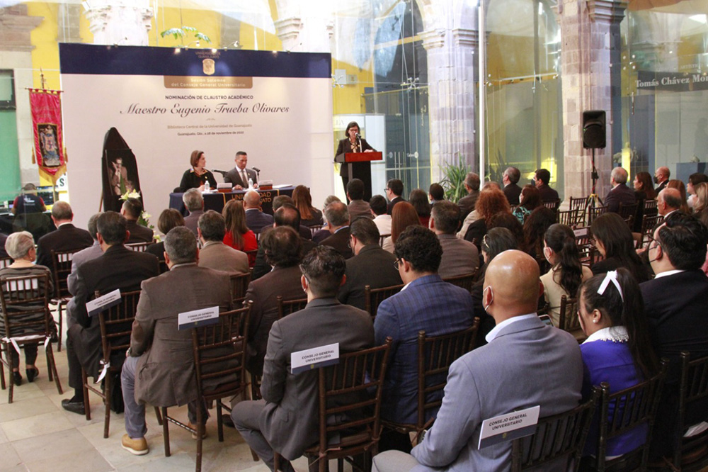 Guanajuato, Gto., a 28 de noviembre de 2022.- En sesión solemne del Consejo General Universitario se llevó a cabo la nominación del Claustro Académico Maestro Eugenio Trueba Olivares, nombre que llevará desde ahora la Biblioteca Central de la Universidad de Guanajuato (UG), un homenaje al legado y trayectoria del ex Rector de esta Casa de Estudios.