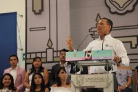 Mencionó que ser estudiante es un proyecto de vida, en el que se depositan metas y sueños por alcanzar. Subrayó que la Universidad de Guanajuato ofrece una educación de calidad que les sirve como soporte para egresar y poder integrarse al mundo laboral o académico. También, los invitó a utilizar el desarrollo tecnológico para desplegar su talento e imaginación.
