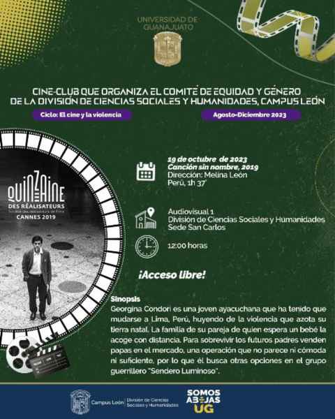 En el cine se presenta “Canción sin nombre, 2019” de Melina León este 19 de octubre a las 12:00 horas en sede San Carlos y en arte de la estrategia el Club Universitario de Ajedrez invita a sus sesiones los lunes y miércoles de las 17:00 a las 20:00 horas en el Mesón de San Antonio en Guanajuato.