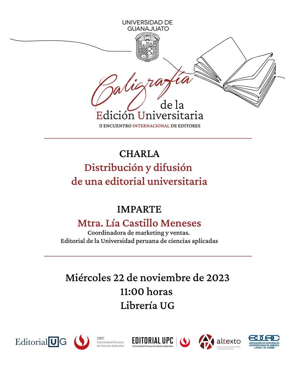 El escenario idóneo para esta cita será la Librería UG, donde se contará con la experiencia de la Mtra. Lía Castillo Meneses, coordinadora de marketing y ventas de la Editorial de la Universidad Peruana de Ciencias Aplicadas, y del Dr. Edgar García Valencia, Miembro del Sistema Nacional de Investigadores e Investigadoras (SNII) Nivel I, e investigador del Centro de Estudios de la Cultura y la Comunicación de la Universidad Veracruzana.