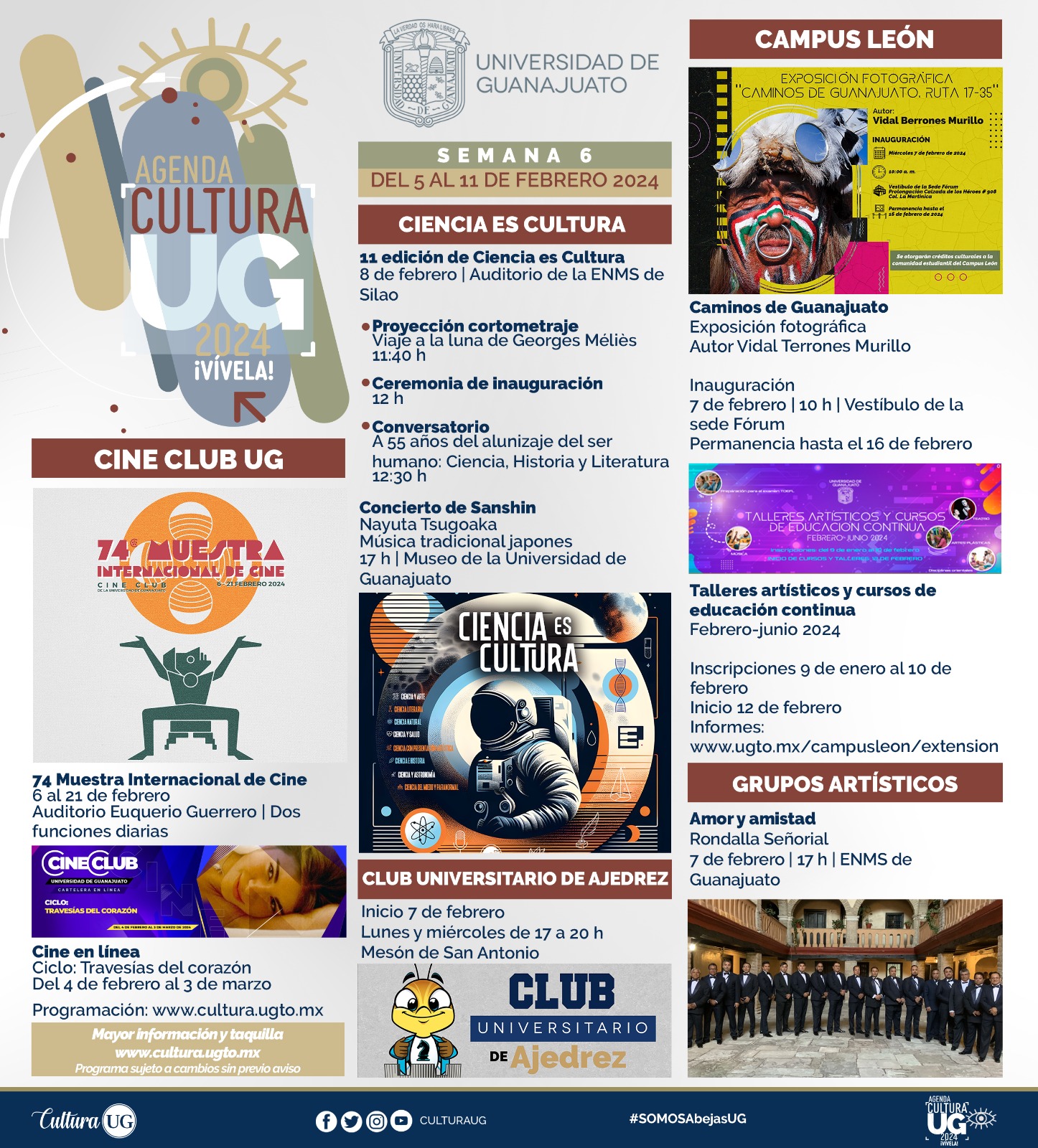 Guanajuato, Gto., a 02 de febrero de 2024.- Proyección de cortometrajes, música, cine, fotografía, talleres artísticos, cursos de educación continua y ajedrez, son la mezcla perfecta para iniciar la Agenda Cultura UG (ACUG) que se realizará del 5 al 11 de febrero 2024 en la Universidad de Guanajuato (UG).