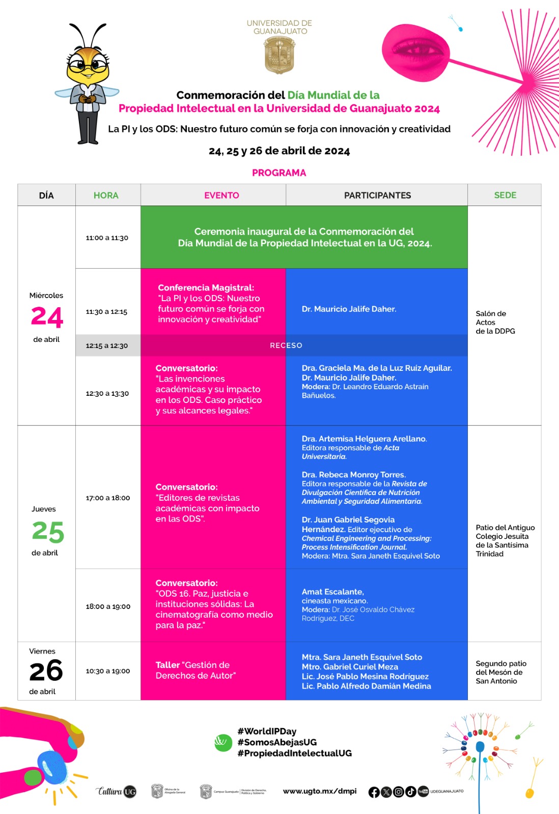 Guanajuato, Gto., a 23 de abril de 2024.- En el marco de la celebración del Día Mundial de la Propiedad Intelectual (PI), la Universidad de Guanajuato (UG) se suma a la agenda de la Organización Mundial de la Propiedad Intelectual (OMPI), la cual se llevará a cabo del 24 al 26 de abril.
