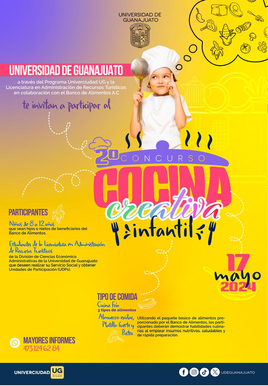 Guanajuato, Gto., a 07 de mayo de 2024.- Con el propósito de fomentar la vinculación entre las y los beneficiarios del Banco de Alimentos de Guanajuato (BAG) y la Universidad de Guanajuato, se llevará a cabo el Segundo Encuentro de Cocina Creativa en su edición infantil, esto como parte del Programa Univerciudad UG Silao.