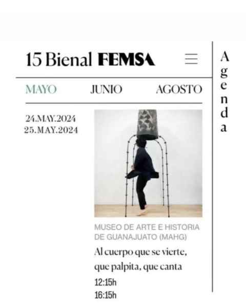 Guanajuato, Gto., a 24 de mayo de 2024.- Comunidad universitaria de la Licenciatura en Artes Escénicas de la Universidad de Guanajuato, participarán en el performance “Al cuerpo que se vierte, que palpita, que canta” los días 24 y 25 de mayo a las 12:30 y 16:30 horas en el Museo de Arte e Historia de Guanajuato (MAHG) ubicado en la ciudad de León, actividad que forma parte de la 15° Bienal FEMSA “La voz de la montaña”.