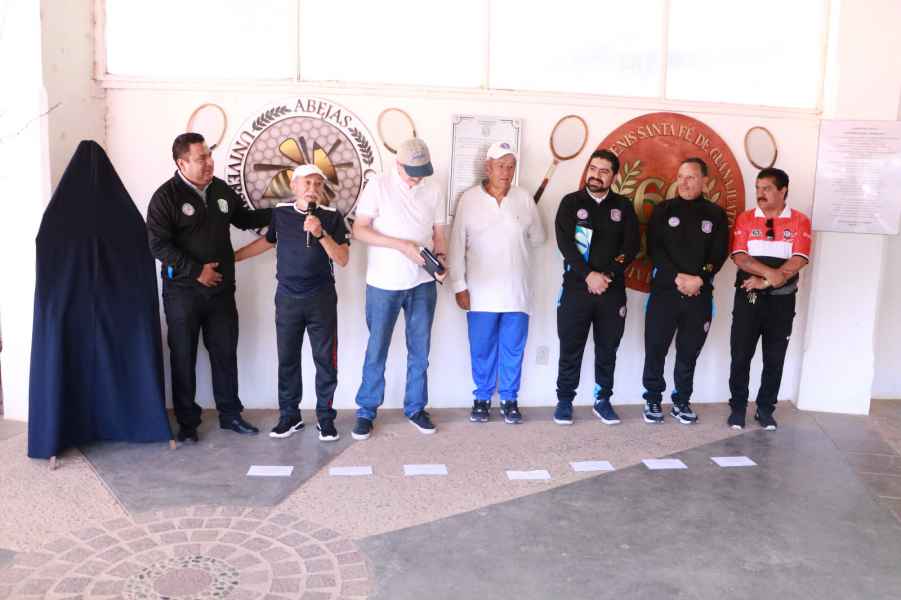 Guanajuato, Gto., a 15 de junio de 2024.- Autoridades universitarias y representantes del Club de Tenis Santa Fe de Guanajuato homenajearon al C. Oscar Urquiza Aguilar por su aportación al deporte de Guanajuato con la develación de una placa en la Unidad Nieto Piña. Lo anterior, en el marco de la edición XXXIX del Torneo de Tenis que se desarrolla en ese espacio universitario.