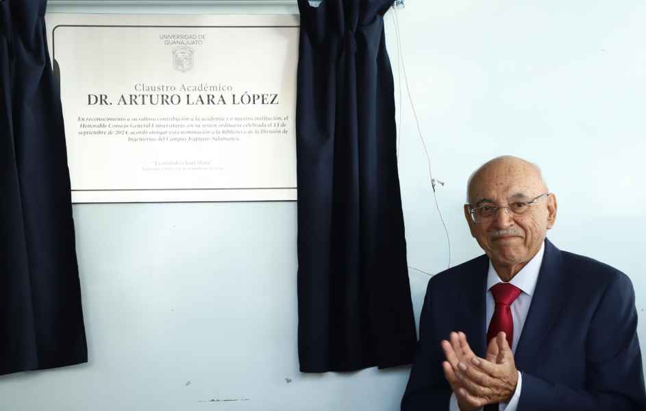 Guanajuato, Gto., a 21 de noviembre de 2024.- En sesión solemne del Consejo General Universitario, se nominó el Claustro Académico “Dr. Arturo Lara López” en la Biblioteca de la División de Ingenierías del Campus Irapuato-Salamanca (DICIS). Así, la comunidad de la Universidad de Guanajuato (UG) expresó su reconocimiento a la trayectoria de ex Rector de la Máxima Casa de Estudios del estado.