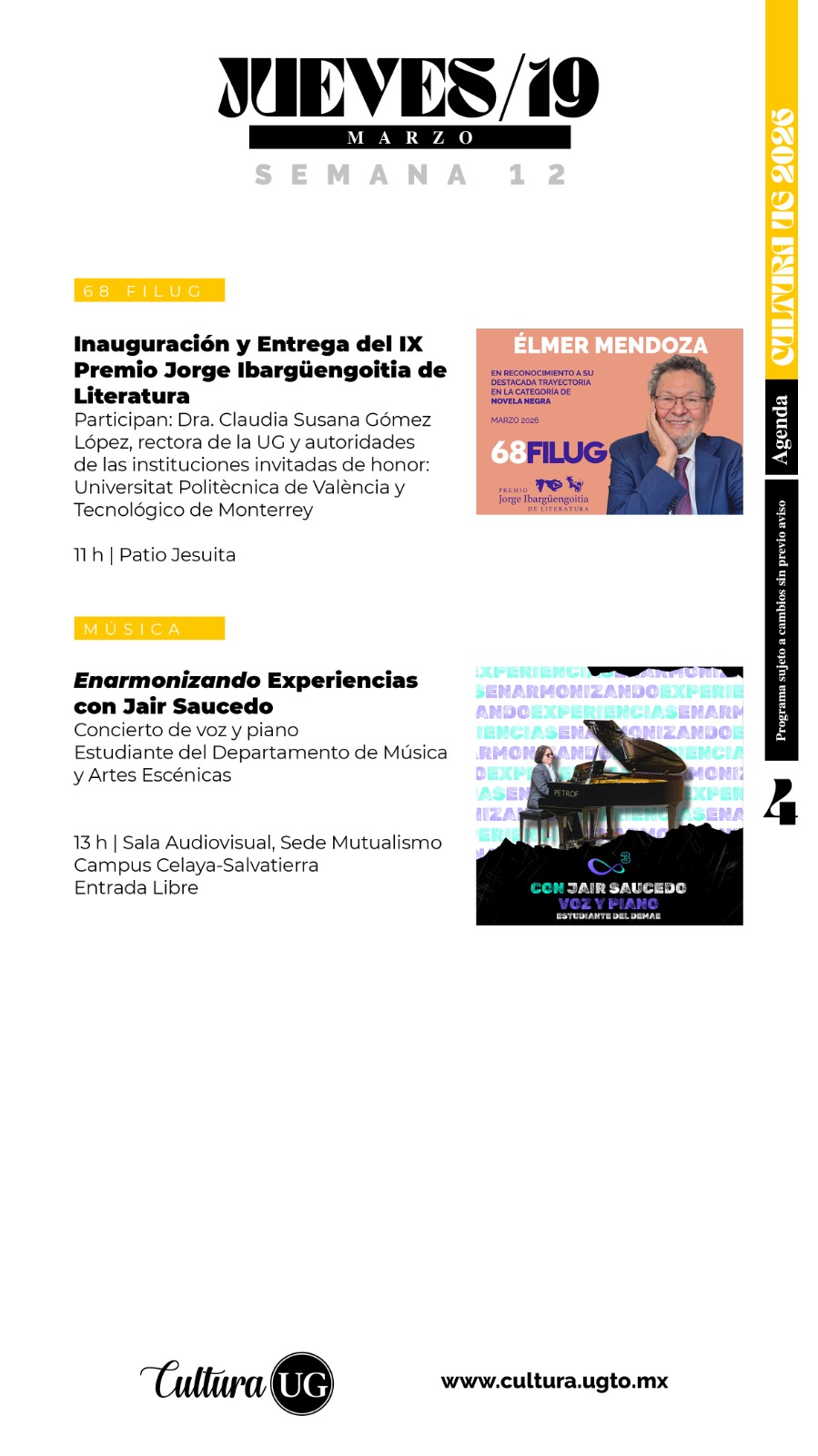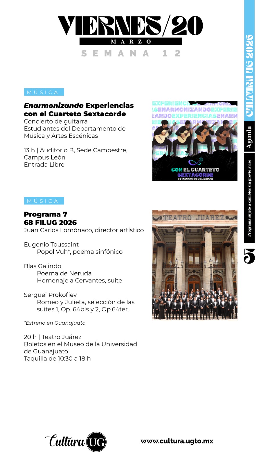 Como parte de la agenda cultural de la UG, también el 19 de marzo, a las 13:00 horas en la Sala Audiovisual en Sede Mutualismo, en el Campus Celaya-Salvatierra se realizará el concierto de voz y piano “Enarmonizando Experiencias con Jair Saucedo”. Y el 20 de marzo se continua con el concierto de guitarra “Enarmonizando Experiencias con el Cuarteto Sextacorde” a las 13:00 horas en el Auditorio B, sede Campestre, en el Campus León.