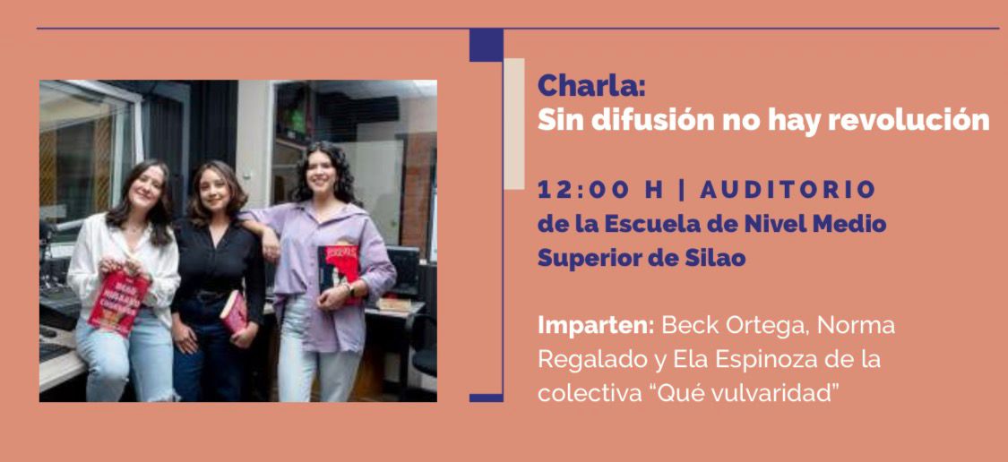 Por su parte, la ENMS Silao será escenario de la charla “Sin difusión no hay revolución”, a cargo de Beck Ortega, Norma Regalado y Ela Espinoza, integrantes de la colectiva Qué Vulvaridad, el 24 de marzo a las 12:00 horas.