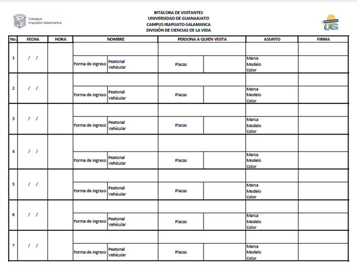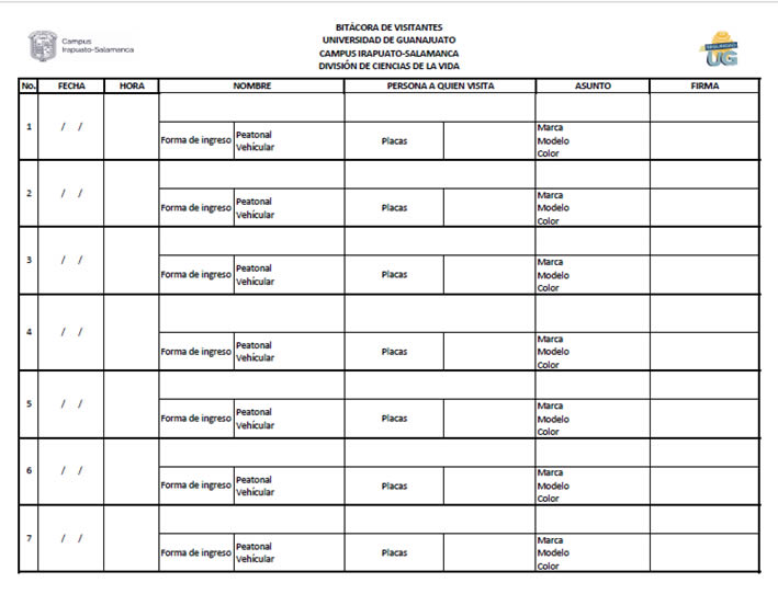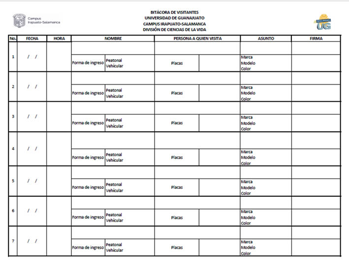 La División de Ciencias de la Vida, estableció mediante oficio emitido por la Dirección, el mecanismo para registro de vehículos y peatones que ingresan a las instalaciones de la División, así mismo, en cada una de las entradas a la sede, fueron colocados anuncios con las medidas de seguridad para ingresar a la División. De igual manera, en cada uno de los accesos, se instruyó al personal para que aquellas personas que fueran a ingresar de manera única o identificadas con la etiqueta de visitantes, realizaran su registro en la bitácora de visitantes para la División de Ciencias de la Vida, así mismo, posterior a su registro, se les entrega un gafete de identificación numerado con la leyenda de “visitante”.