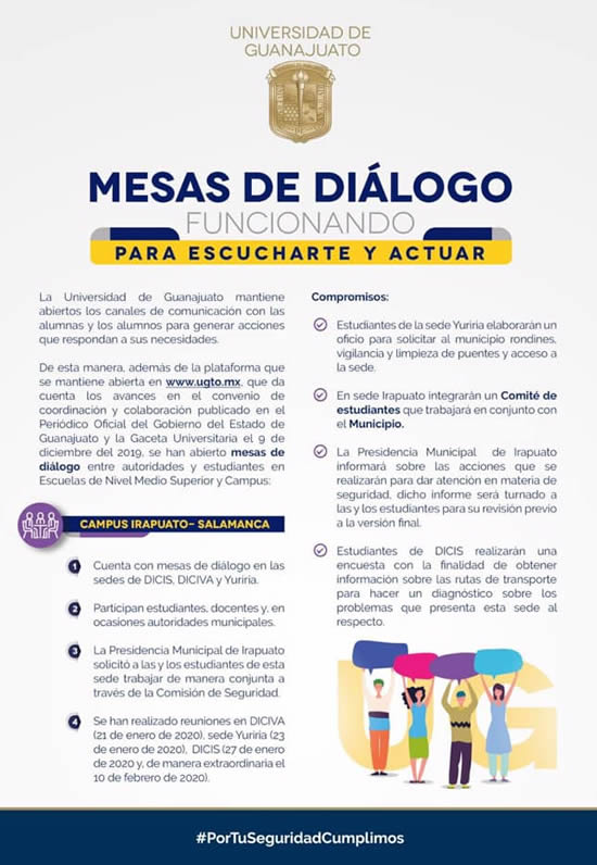 - Mediante oficio DICIS/2020-032 del 21 de enero de 2020, la doctora Rocío Alfonsina Lizárraga Morales, Directora de la División de Ingenierías del Campus Irapuato-Salamanca, hizo extensivo el compromiso de que no deberán existir repercusiones negativas para cualquier persona que haya participado directa o indirectamente en el movimiento. En el caso de que cualquier integrante de la comunidad universitaria ejerza actos o conductas análogas que afecten los derechos de cualquier integrante de la comunidad estudiantil, se actuará en estricto apego a lo establecido por la Ley de Responsabilidades Administrativas de los Servidores Públicos del Estado de Guanajuato y sus Municipios, al Reglamento de Responsabilidades en el Entorno Universitario y el marco jurídico general aplicable con el acompañamiento de la Defensoría de los Derechos Humanos en el Entorno Universitario.